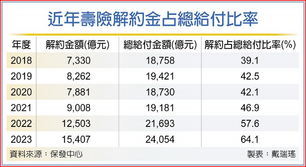 根據保發中心最新統計,去年全年壽險保單總給付2兆4,054億元、創歷史新高,年增10.9%,增加最多是解約金、來到1兆5,407億元,較2022年增加2,904億元,年增幅度高達23.2%,主要為利變型壽險、傳統型壽險解約所致。
