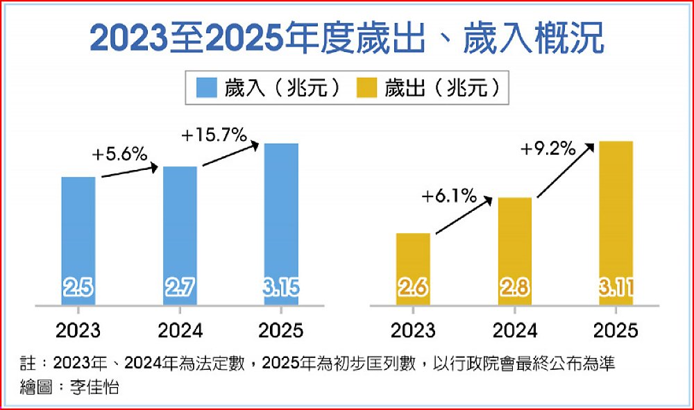 歲出部分,較前一年度增約2,600億元,估將超過3.11兆元,成長9.2%。其中,公建預算請增額度加碼達2,510億元,增加幅度最高,當中包括占比最高的交通建設,以及環境資源計畫、農業建設等,凱米颱風後治水預算也會調整追加,若加上前瞻與基金,整體公建規模可望突破6,000億元大關。