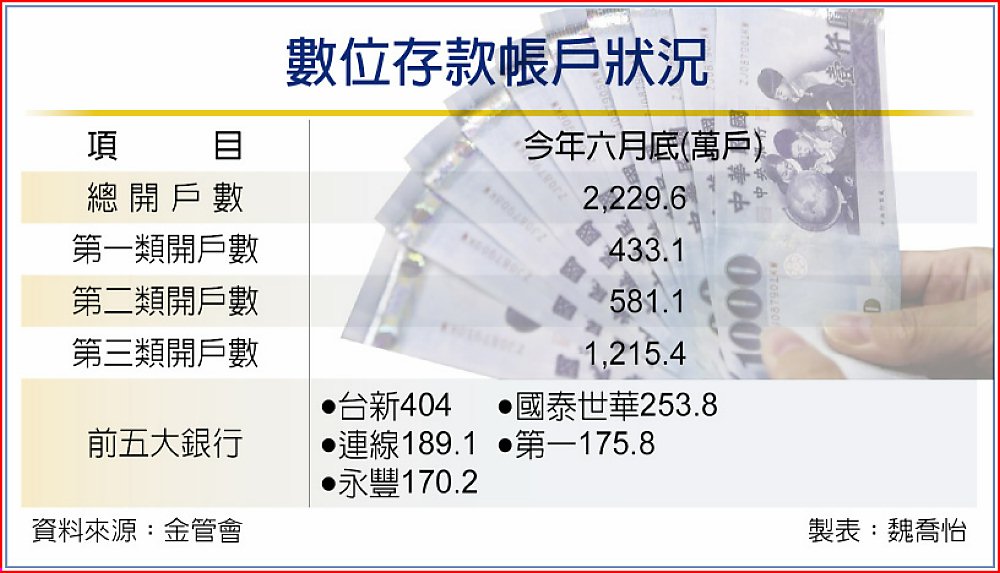 目前數存開戶數前五大銀行依序為台新銀行404萬戶、國泰世華銀行253.8萬戶、連線銀行(LINE Bank)189.1萬戶、第一銀行175.8萬戶、永豐銀行170.2萬戶。