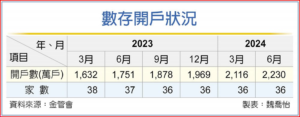 金管會分析,至6月底開戶數較首季增加113.5萬戶、季增率5.4%,較去年同期則增加479.7萬戶、年增率達27.4%,但略低於第一季的季增率7.5%、年增率29.8%。銀行業者表達成長趨緩原因,一是部分銀行行銷推廣活動及優惠減少,導致開戶誘因降低;二是整體銀行數存帳戶開戶數因近年持續增加,基期墊高,也讓成長率趨緩。