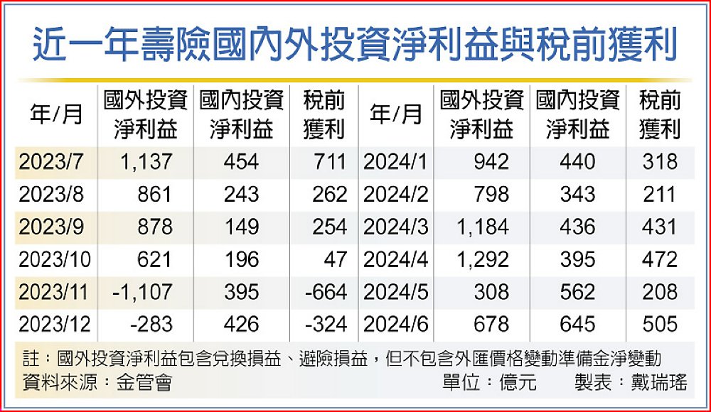 近一年壽險國內外投資淨利益與稅前獲利