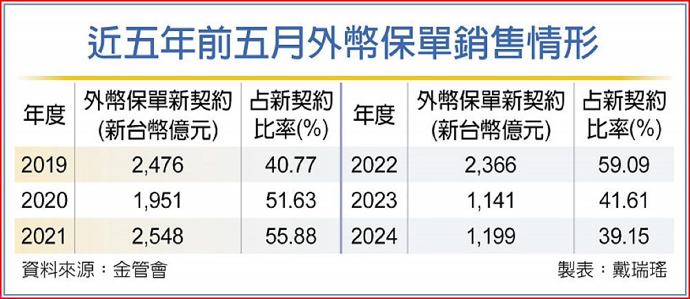 5月以澳幣保單表現最佳,傳統型保費0.25億澳元,創2020年8月以來、46個月新高,投資型也有0.63億澳元,也創七個月新高;前五個月外幣保單新契約保費達1,193億元、年增5%,買氣成長最多的是傳統型保單,新約保費1,015億元、年增15%,反而投資型買氣衰退只賣出185億元、年衰退28%,顯示上半年外幣保單主要靠傳統型保單支撐。