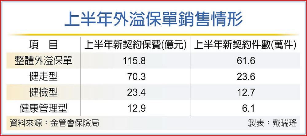 另外,有的外溢保單同時有兩種以上回饋機制的混合型保單,至6月底混合型保單共有48張,上半年賣出19.2萬件、9.2億元,年增各4%、9%。