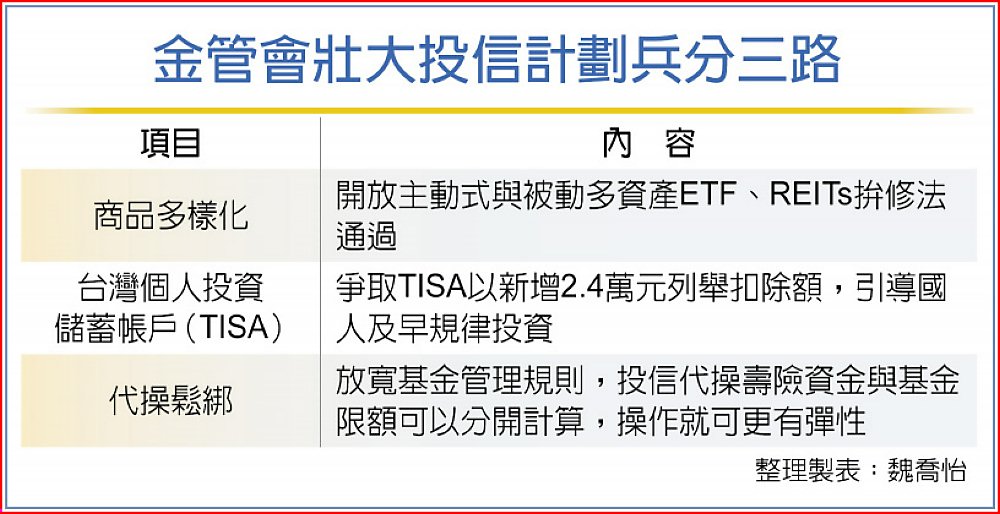 投信業者亦已積極向金管會建議,若拿掉基金管理辦法的10%投資天花板限制,如全委代操與旗下基金的額度分開計算,甚至比照國外沒有投資上限,就可更有彈性,且修改管理辦法,金管會就可拍板。