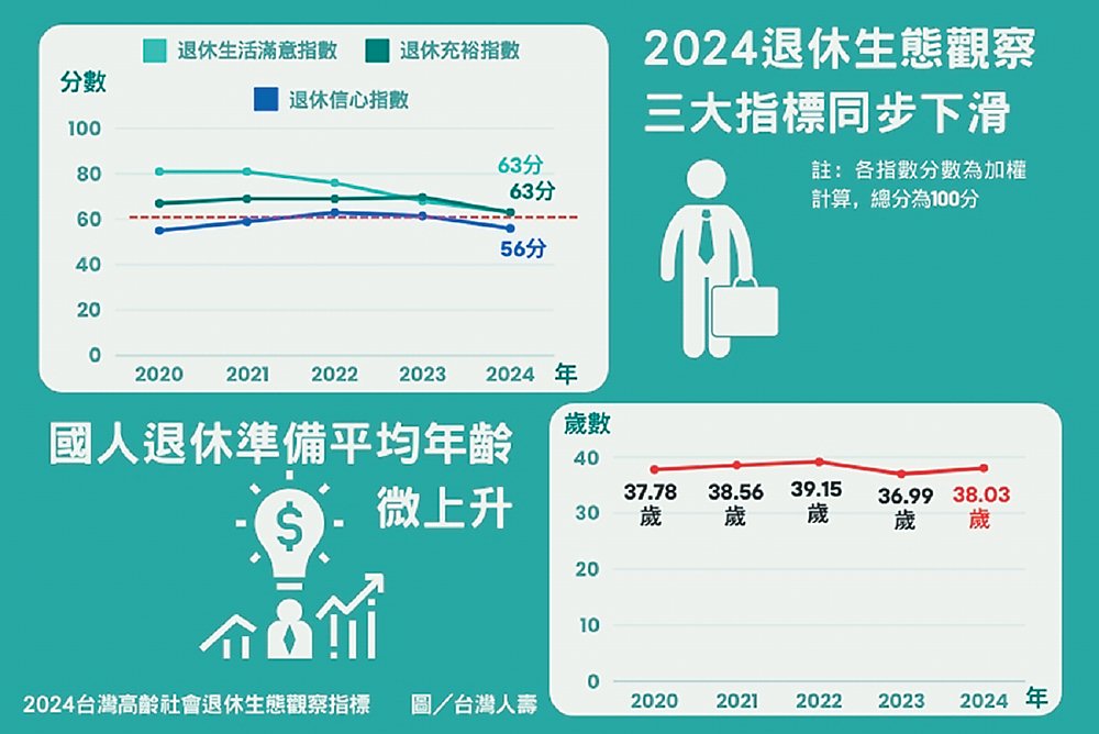 追蹤五年的「退休生態觀察指標」,今年退休三大指數首度全數走弱,其中「退休生活滿意指數」、「退休充裕指數」雙雙跌至63分,勉強守住六字頭,卻是歷年最差;「退休信心指數」僅有56分,五年來三度不及格;民眾退休準備平均年齡38.03歲,其中年輕世代退休準備平均年齡為41.8歲,較全體平均年齡晚了3.77年,顯見青世代面對通膨高物價衝擊,退休準備心有餘卻力不足。