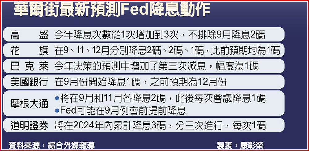 花旗集團經濟學家克拉克(Veronica Clark)等預測,Fed會在9月、11月各降息2碼,12月再降1碼,原先預測為9月、11月及12月皆降息1碼。預期到2025年初,聯邦基金利率將降至3%到3.25%區間。