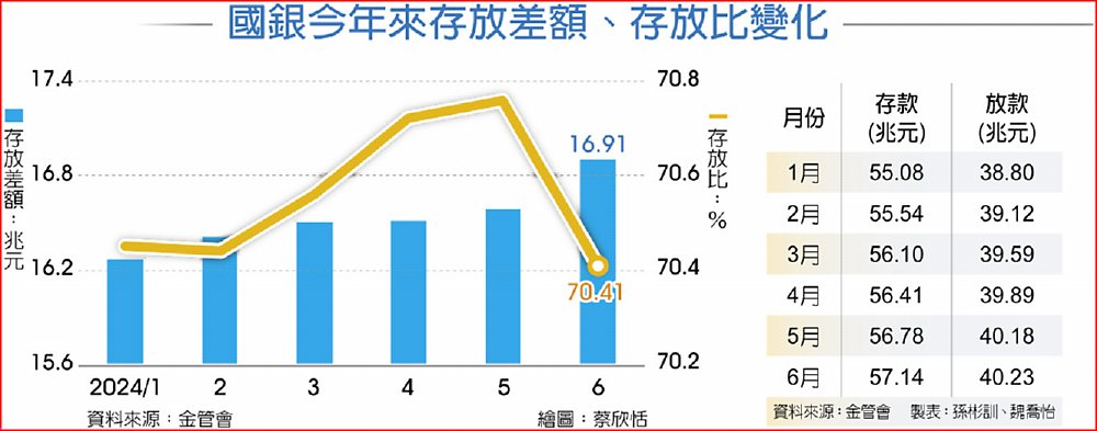 銀行局主秘侯立洋表示,由於海外股利匯回、政府基金投資收益及出口成長、貨款收入增加,國銀6月底存款餘額達57.15兆元,單月增加近3,572億元。今年除1月存款只淨增1,602億元,其餘五個月都增加3,000~5,000多億元不等,放款上半年淨增1.77兆元,6月僅淨增535億元,國銀存放比6月底降到70.41%,創半年新低。