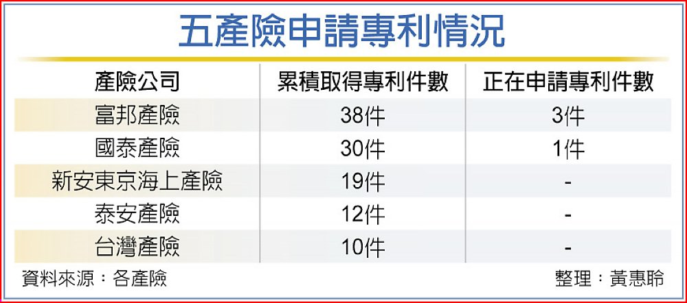 富邦產險、國泰產險、新安東京海上產、泰安產險以及台灣產險等多家產險在疫情期間分別取得多項專利,截至目前為止,取得專利數分別有38項、30項、19項、12項及10項等。