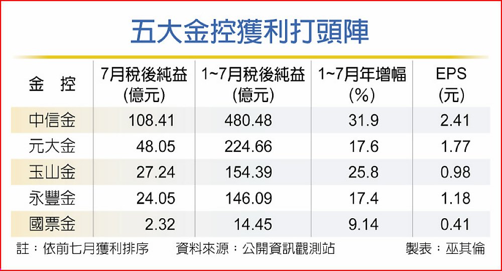 元大金前七月稅後純益224.66億元,是今年第六家累計獲利突破200億元的金控;玉山金前七月稅後獲利154.4億元、永豐金146.09億元,三金控均寫下同期獲利新高。