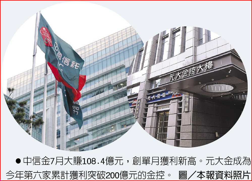 ●中信金7月大賺108.4億元,創單月獲利新高。元大金成為今年第六家累計獲利突破200億元的金控。圖/本報資料照片