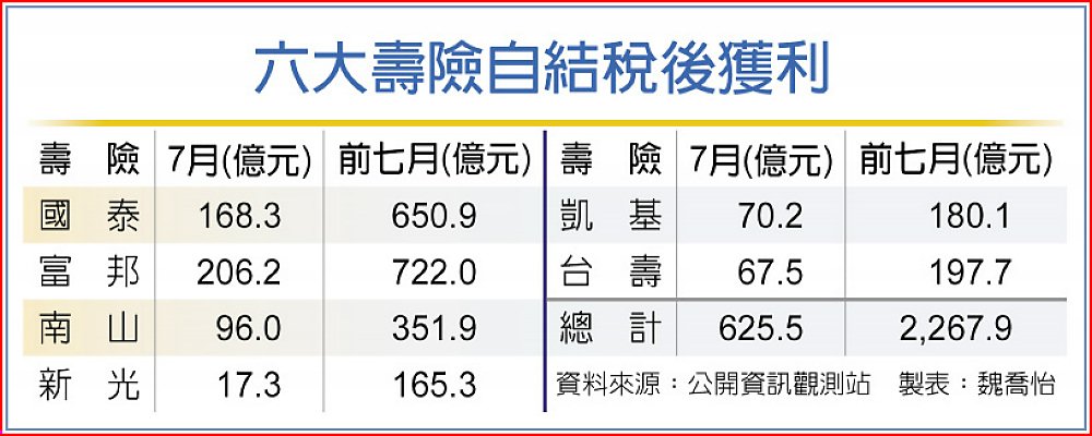 除了獲利大幅成長外,六大壽險7月靠著新台幣兌美元貶值逾1.1%,外幣部位若不避險的匯兌利益逾新台幣1,300億元,避險後匯兌利益近350億元,因此增提331億元外匯準備金,7月底六大公司共有1,671億元的外匯準備金,比年初多近千億元。