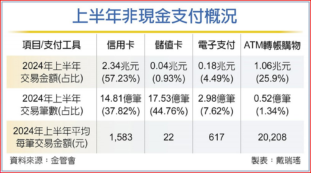 金管會今年初公布最新一期非現金支付目標,即2026年非現金支付交易筆數要達80億筆,交易金額要達10兆元,等於全台民眾平均每人、每年要有340筆非現金支付的交易,非現金的年消費金額平均要達42.5萬元。金管會統計,上半年國人非現金支付交易筆數共39.16億筆、交易金額達4.1兆元,筆數年增24.99%,金額則也年增13.75%,筆數及金額都創同期新高,就目前成長進度來看,有機會2026年達標筆數80億筆、金額10兆元。