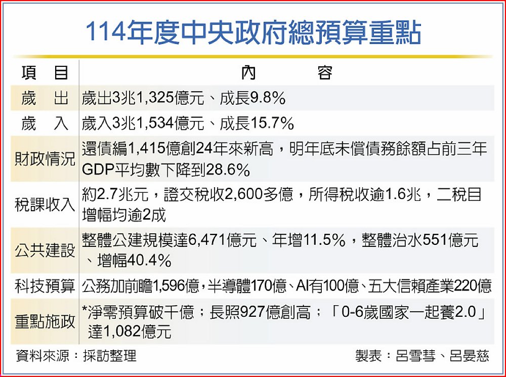 明年總預算五大特點為:歲出入有賸餘,未新增特別預算,總預算並未舉債;歲入面突破3.15兆元,成長約15.7%。稅課收入約2.7兆占比8成,較今年法定數增加4,000億元、成長約17.3%;央行繳庫2,000億蟬聯繳庫王;國發基金明年保留盈餘不繳庫用於新政投資。