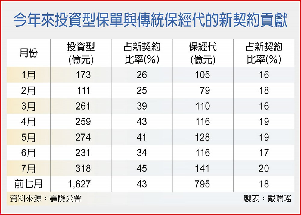 第二個轉變是傳統保經代茁壯,7月保經代業績達141億元,連五月賣破百億元,貢獻壽險新契約保費來到20.2%,成為史上首度站上2成,不管業績或貢獻占比皆創高。