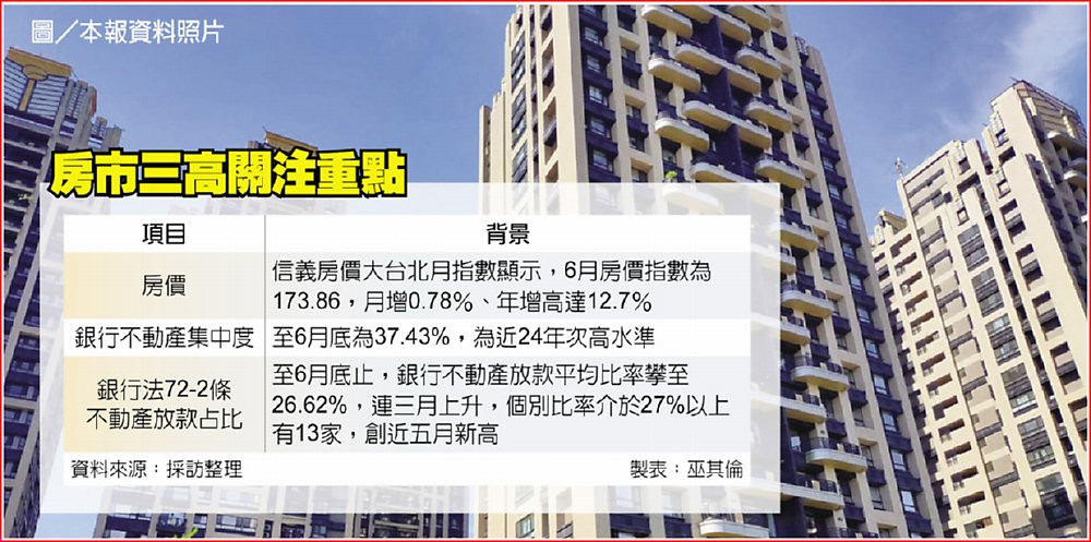 國內房市居高,主要統計數據仍居高,市場歸咎新青安政策推升剛性需求等因素,使房市仍具一定量能。當前房市仍有「三高」疑慮,一是房價、二是銀行法72-2條的不動產放款占比、三是不動產放款占總放款比重(集中度),恐影響整體金融穩定,央行數度表態會「密切滾動式檢討」。