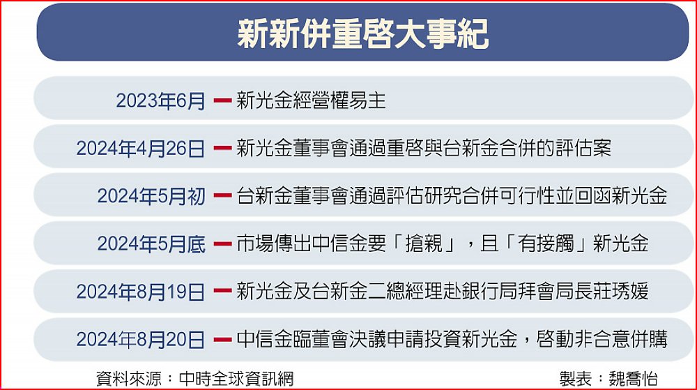 台新金、新光金19日才剛拜會金管會銀行局局長莊琇媛,報告合併計劃,20日中信金就緊急召開臨時董事會,並宣布董事會決議通過將進行重大轉投資,公開收購新光金股份,全案將待主管機關核准後進行。