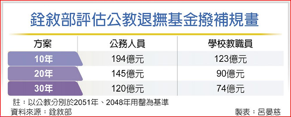 根據銓敘部估算,若以公、教於2051年、2048年用罄年度為基準,採「10年」、「15年」及「20年」三種不同方案補足退撫基金,每年所需撥補金額分別為「公194億元、教123億元」、「公145億元、教90億元」、「公120億元、教74億元」,才能讓退撫基金永續發展。