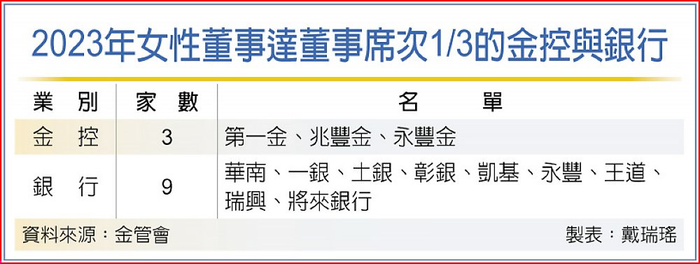 根據金管會統計,以2023年年報來看,15家金控中已有3家符合任一性別董事席次達1/3者,即第一金、兆豐金、永豐金等;38家國銀中,也有9家銀行達標,包含華南、一銀、土銀、彰銀、凱基、永豐、王道、瑞興、將來銀行等。