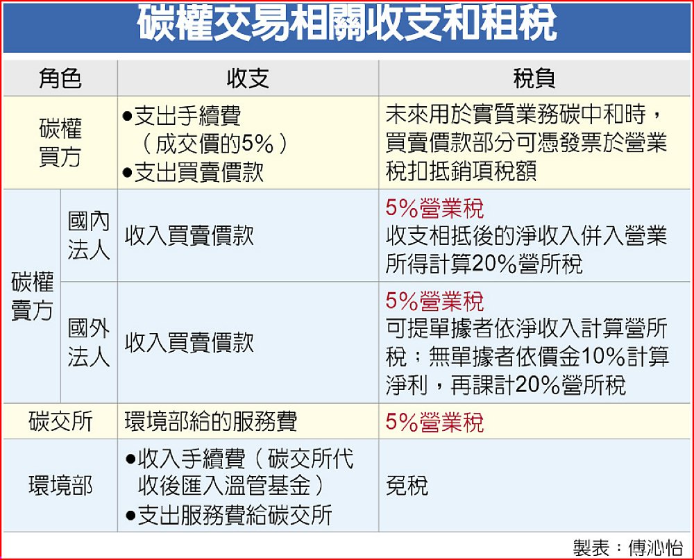 至於企業買進碳權後,未來若是將碳權實際用於業務的碳中和,例如產品訂單、公務出差等,可憑當時買進碳權的發票,於申報營業稅時扣抵銷項稅額。至於營所稅,財政部表示,國內碳權賣家相對單純,只要以收入減除成本費用後併入營利事業所得額,並適用營所稅率20%計算。