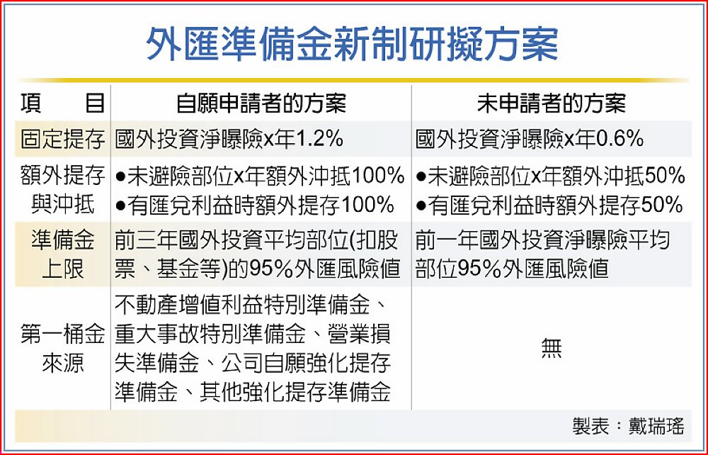 在提存與沖抵上,固定提存比率從現行一年0.6%,將提高到1.2%;額外提存與沖抵比率擬從現行的50%拉高到100%,若有匯損可用外匯準備金完全沖抵,直到準備金為零。