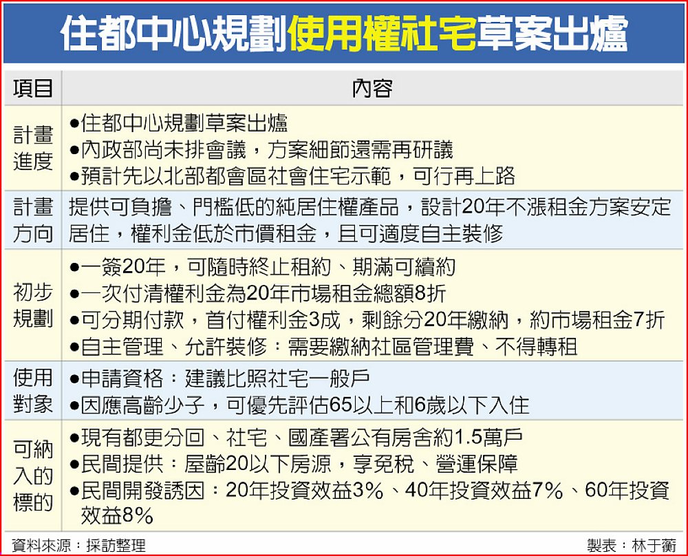 不過,內政部長劉世芳強調,「使用權宅」是還在研議中的政策,沒有上路時間表。她說,若方案研議妥適,後續預計會選定人口密集的北部現有社宅作為示範,運作順利再上路;同時,在使用年限上、以及是否限定單身無房、甚至年紀等條件,還需要評估考量。