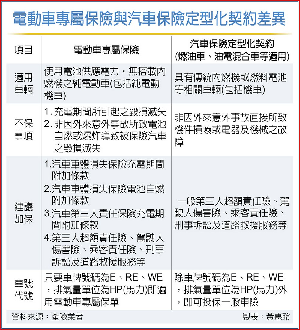 明台產險進一步說,電動車主投保原車險時,非因外來意外事故之電池自燃或爆炸、充電期間因充電所致毀損…等狀況都在理賠範圍內,是不需特別針對電動車加保相關附約。