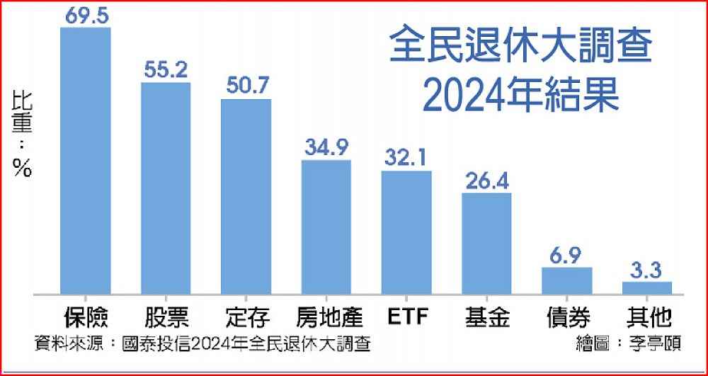 值得注意的是,與三年前的調查結果相比,選擇ETF的人次成長高達4倍,比重從8.8%躍升至32.1%,居總排名第五,成為調查退休理財商品的大黑馬。