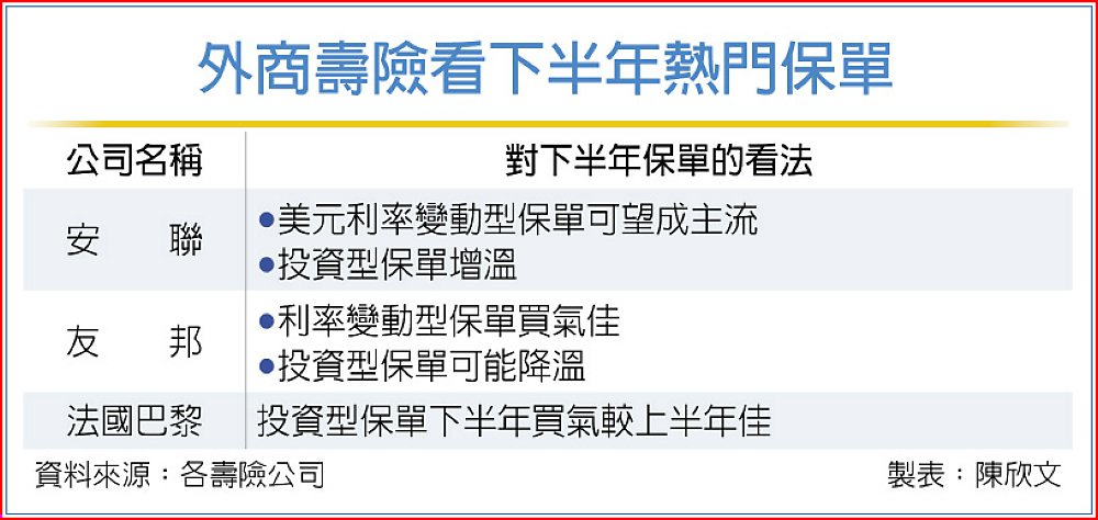 上半年利率變動型商品初年度保費較去年同期持平,仍是銷售最佳;下半年因為市場預期美國降息,且各家壽險公司接連拉高宣告利率,美元利變保單宣告利率紛紛突破4%以上,帶動利率變動型商品的買氣,安聯、友邦人壽認為,利率變動型商品仍會是主流。