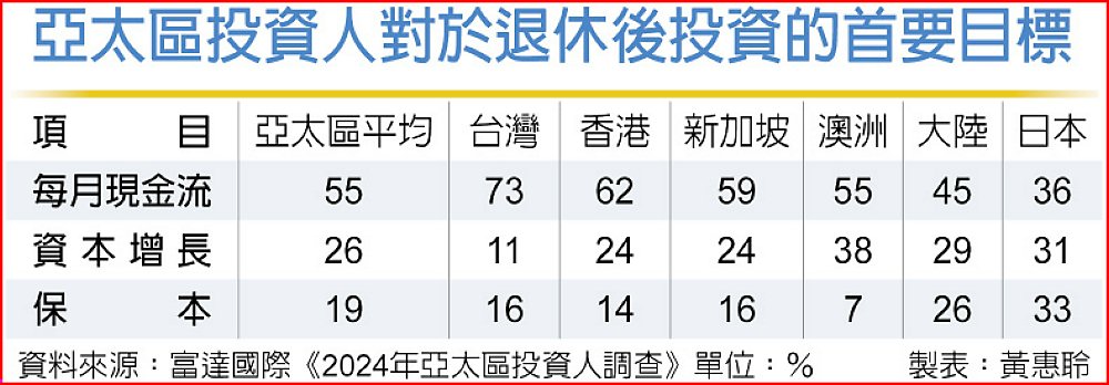 有關退休後投資,台灣受訪者73%最在意「每月擁有固定收入」且對收益的期待平均高達8.1%,高於亞太區整體的55%、7.3%,也是亞太區最高。台灣前三大投資產品是69%股票/股票型產品,40%為債券或債券型產品,40%為定存;反觀亞太區投資人則相對保守,只有49%考慮投資於股票及股票型產品、35%為債券及債券型產品、43%為定存。