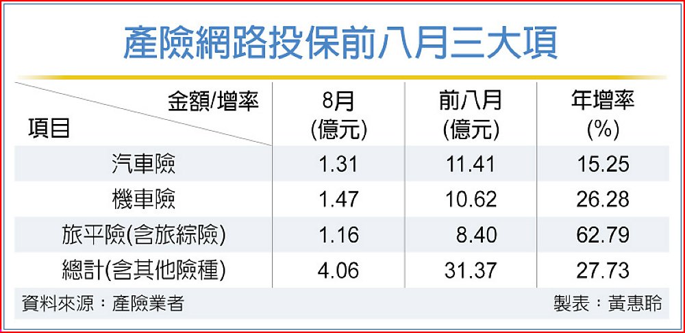 產險前八月網路投保金額已逾31億元,較去年同期24.6億元年增近28%。汽車險、機車險產險前八月的保費都逾10億元,分別是11.41億元、10.62億元,雖然機車險前八月網路投保保費略低於汽車險,然在7月、8月時機車險網路投保件數不但超過汽車險,機車險單月保費也超前汽車險,成為網路投保最大宗。