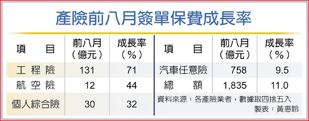 產險前八月簽單保費年增率最高的前三名分別是工程險、航空險及個人綜合險,加上占比最高的汽車任意險也較去年同期成長9.5%,締造產險業前八月簽單保費的高成長率。