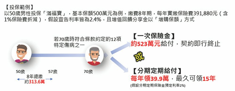 國泰人壽推出「滿福寶利率變動型終身保險」具高倍數身故保障,更結合12項易致成長期照顧狀態的特定傷病給付,包括嚴重阿茲海默氏症、嚴重巴金森氏症、癱瘓(重度)等,一旦發生特定傷病可以提前領取保險金,可兼顧累積資產以及長期照護的風險。保險金亦可以選擇具類信託功能的分期定期給付,讓保障能更彈性。