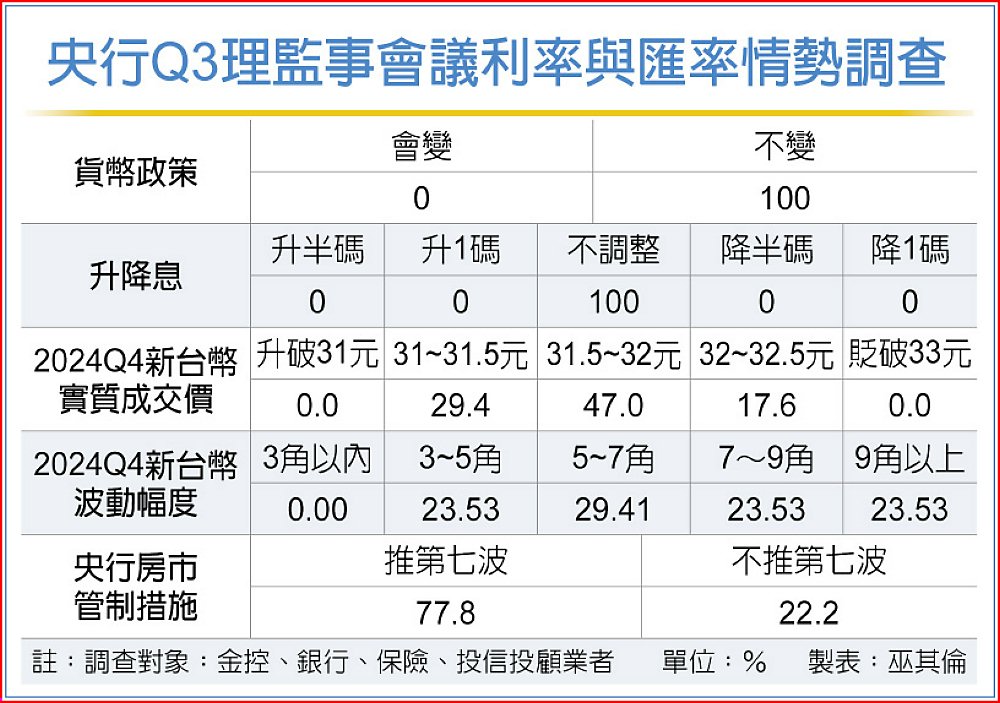 新台幣匯率方面,匯銀對第四季新台幣實質成交價看法相對分歧,近半數預估美國9月降息後,新台幣有望回升至31.5元~32元;近3成認為有望衝到31元~31.5元;約2成認為持續在32元~32.5元區間徘徊。波幅方面,29.41%認為幅度在5角~7角,其他估計幅度3角~5角、7角~9角、9角以上各有23.53%。