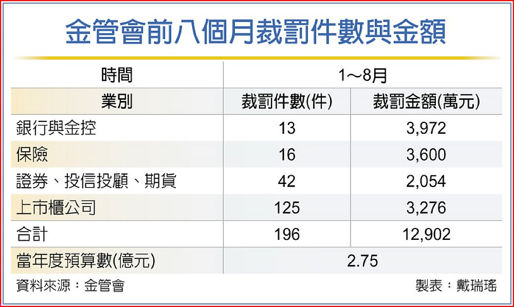今年金管會行政罰鍰預算為2億7,468萬元,至8月底達成率約47%,還不到5成,若到年底前未有大罰單的話,今年行政罰鍰金額將會低於預算數。