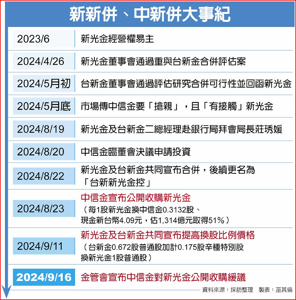 中信金明知台新金與新光金要合意併購,金管會也有問中信金要如何處理,但中信金卻無完整說明,準備不夠妥適,後續在股東會後,中信金如果可以提出更符合期待的併購計畫,也不一定要是新光金,會針對新的計劃審慎考量。