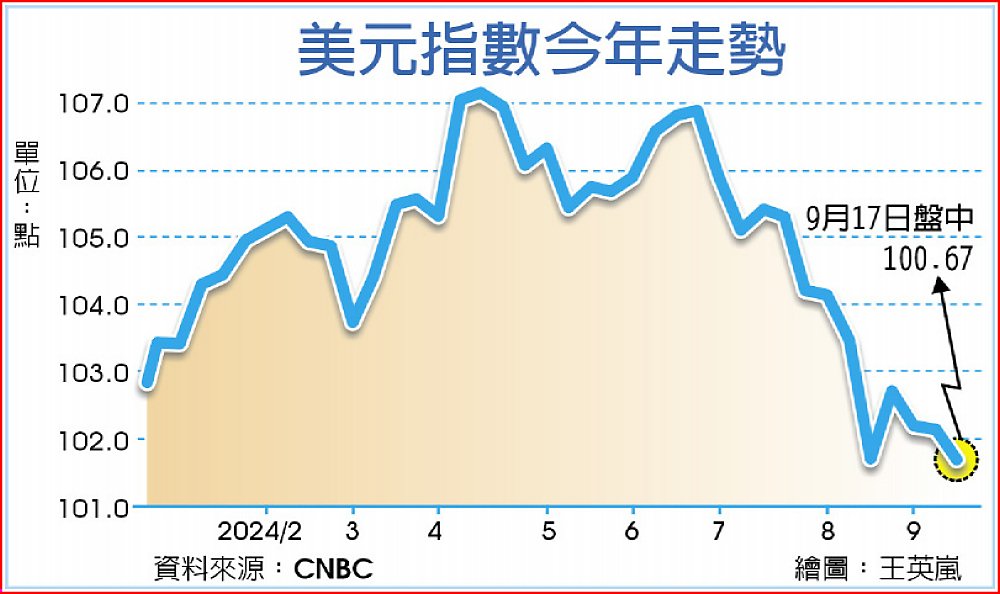在市場預期Fed將透過激進降息來開啟本次降息循環,美元指數17日盤中下滑0.14%到100.62,再度面臨100大關保衛戰。至於對利率政策特別敏感的2年期美債殖利率也跌落至3.554%、創2022年9月新低。美債殖利率與價格呈反向走勢。此外,道瓊工業指數更率先反映降息利多,16日收盤締造紀錄高點。