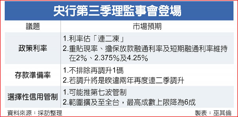 各界關注的房市管制相關議題,將是本季會議焦點所在。觀察第六波信用管制推出後,國內房市未降溫,央行這次會議不排除對房市管控再加碼,即延續第二季決策基調,且除了信用管制,不排除搭配調升存準率應對市場現況。