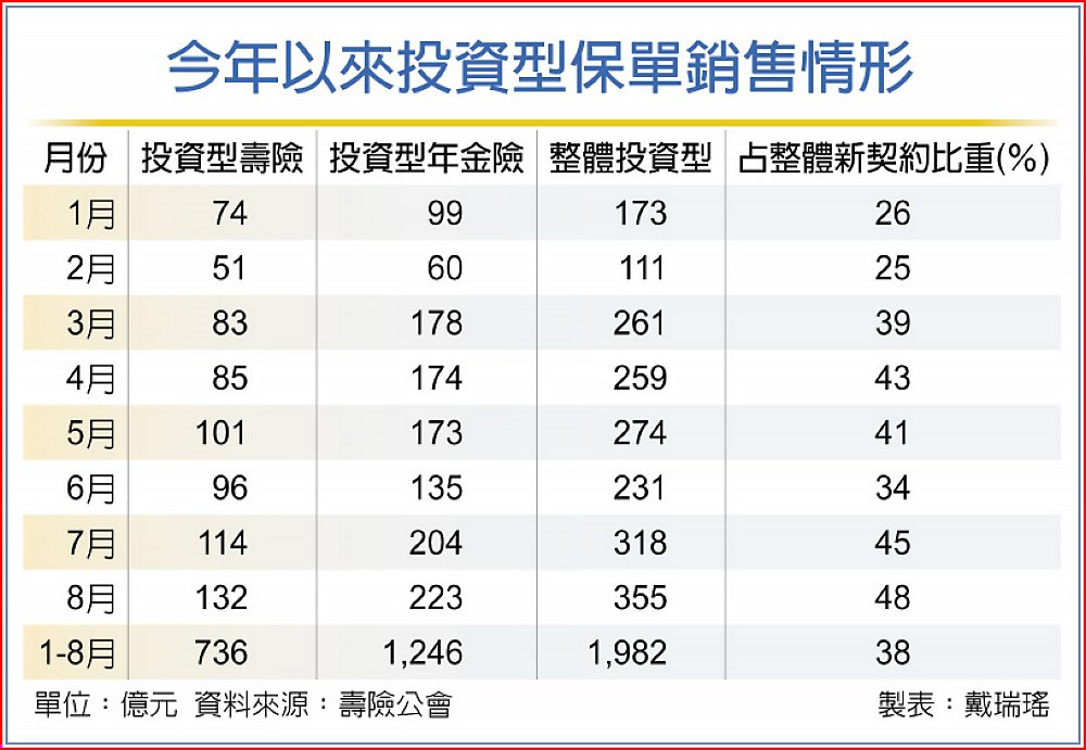 前八月投資型保單已賣1,981億元,幾乎已追上去年同期的1,987億元,預估今年銷售可望追平去年全年的2,565億元,甚至有機會超越。