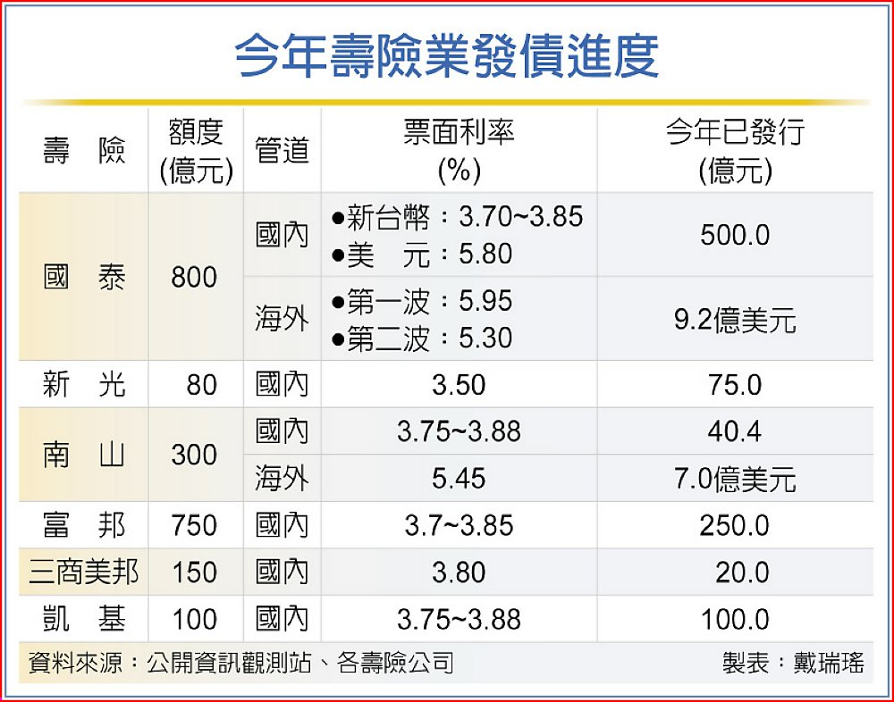 今年以來啟動發債的壽險有國泰、新光、南山、富邦、三商美邦、凱基,六家的國內發債利率除新光3.5%外,其他大多在3.7%~3.8%,10年期大多3.7%~3.75%,15年期3.85%~3.88%,且今年國泰、南山更啟動壽險史上首次的海外發債,票面利率皆5%以上。