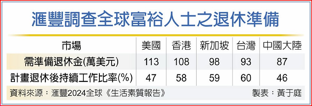 調查指出,富裕族群認為需準備的退休金前三名,分別是美國113萬美元、香港108萬美元、新加坡98萬美元;台灣為93萬美元(約新台幣2,970萬元),才能安穩退休。調查訪問包含台灣、新加坡、馬來西亞、中國大陸、香港、印度、印尼、阿拉伯聯合大公國、英國、美國和墨西哥等市場,橫跨25~69歲、擁有10萬~200萬美元可投資資產的富人,台灣約500人受訪。