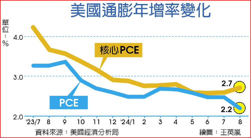 美國聯準會最重視的通膨衡量指標-8月個人消費支出(PCE)物價指數出爐,整體PCE通膨年增2.2%,創下2021年初以來最低水平。圖/美聯社
