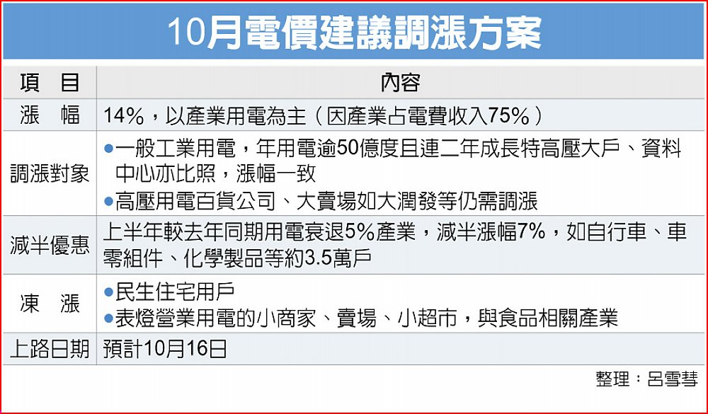 根據台電規畫,為照顧營運較辛苦產業,上半年用電年減5%以上,漲幅減半優惠,只調漲7%,涵蓋自行車、汽車零件、化學製品製造業等。