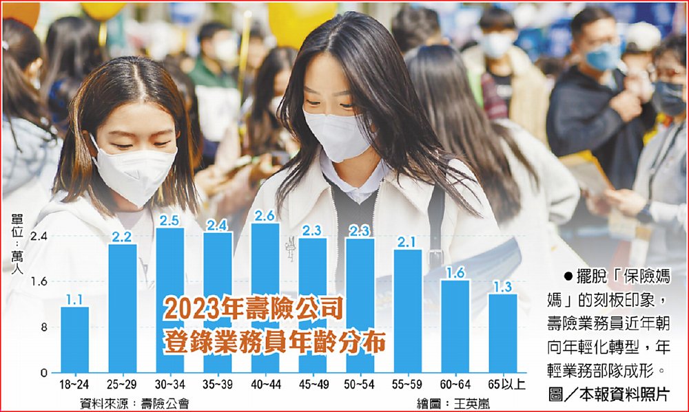 壽險公會分析,至去年底壽險業務員(含銀行通路、保經代)總登錄人數為37萬5,864人,若觀察壽險公司登錄的業務員人數20.8萬人中,18歲至34歲年輕族群共有5萬9,338人,占比高達28.5%,相比55歲以上者則下降到5萬1,487人,占總登錄人數 24.6%。