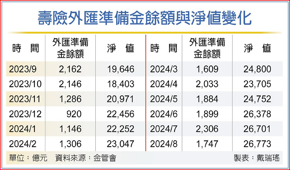 受新台幣急升衝擊,8月壽險緊急動用559億元的外匯準備金做沖抵,以維持獲利平穩,導致外匯準備金餘額再次失守2,000億元關卡,8月底僅剩1,747億元,為五個月新低。9月新台幣持續升值,預期壽險業仍會動用外匯準備金來抵禦匯率波動。