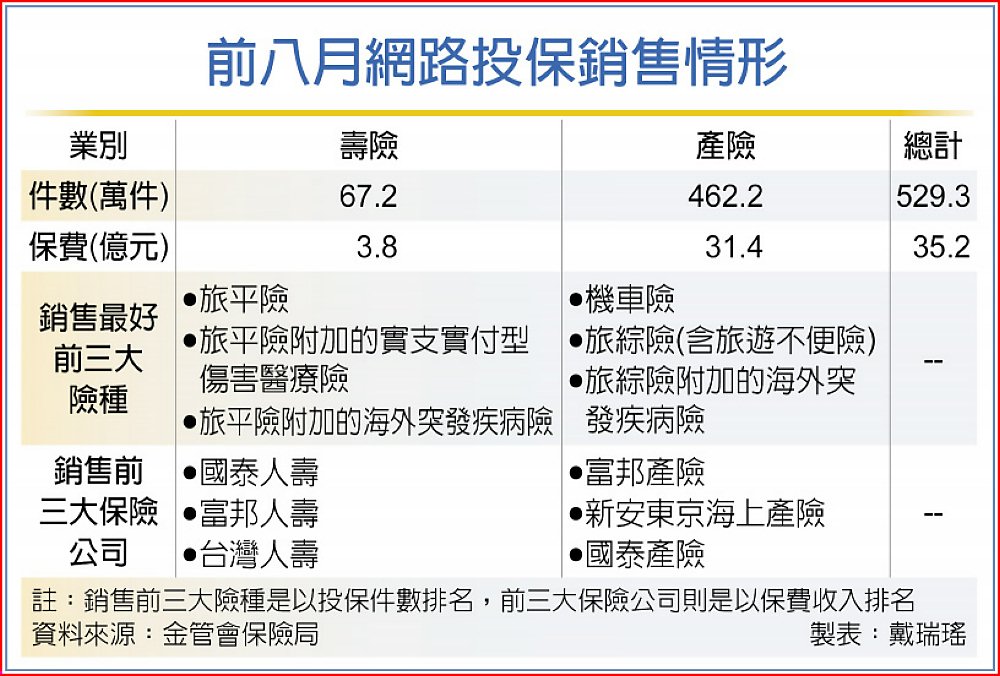 前八月網路投保保費收入來到35.2億元,暑期兩個月增加9.4億元之多,整體保費收入來自產險公司銷售的機車險,保費收入超過10億元,其次來自產、壽險公司賣的旅平險相關保單,保費收入也超過7億元。若成長速度未變,預估今年網路投保的保費收入有望超過50億元大關,超過去年全年的44億元。
