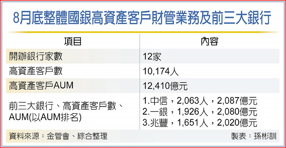至今年8月底已有12家國銀開辦財管2.0的高資產客戶財管業務,整體客戶數達10,174人,資產規模達1兆2,410億元,其中,中信銀行、第一銀行、兆豐銀行分居前三大。