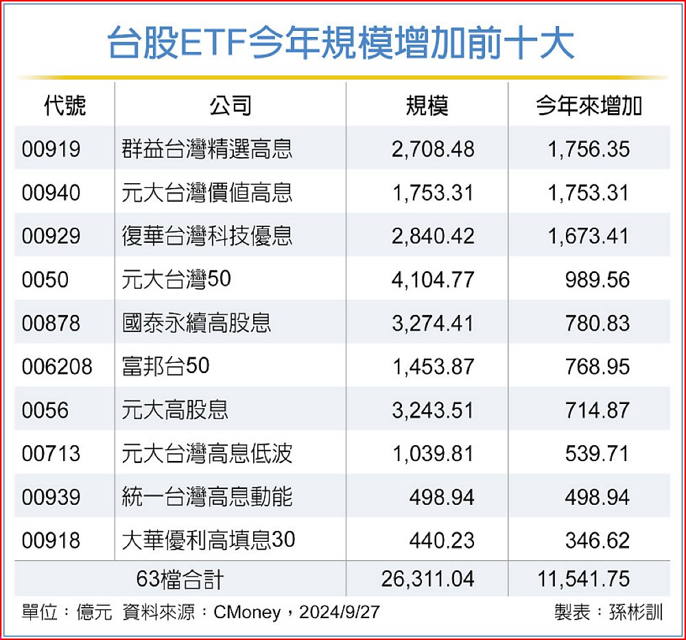 觀察台股ETF規模,截至9月27日,統計63檔台股ETF規模今年來共增加逾1.15兆元,規模來到2.63兆元,創新高紀錄。圖/本報資料照片