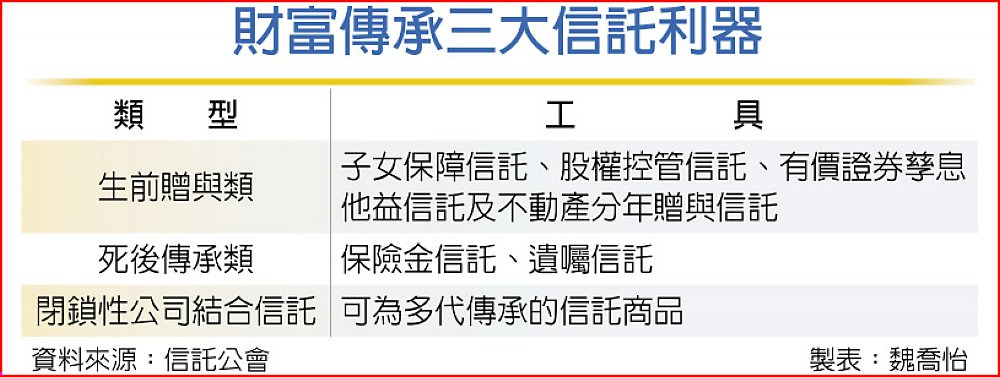 包括事業承繼信託、遺囑信託及遺囑代用信託,均為委託人死後企業及財產傳承安排,性質上與遺囑類似,均為委託人神智清楚時之身後安排,信託公會也參考日本廣泛運用於個人財產管理及遺產傳承與分配的遺囑代用信託制度,委託研擬相關契約供業者參考。
