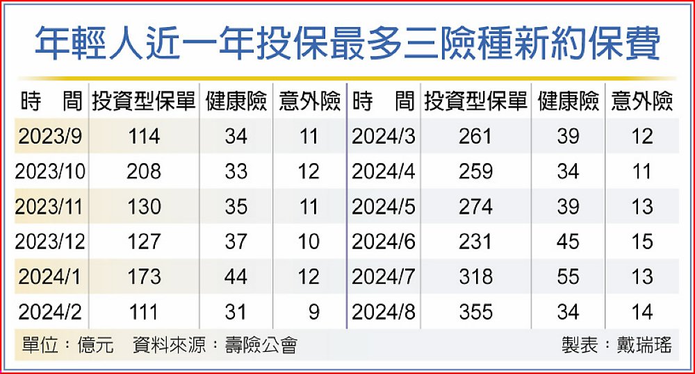 若區分保障型與理財型,據公勝保經內部統計,35歲以下年輕保戶,投保件數占比最高前三名,分別是醫療險、意外險、定期壽險,主要還是保障型商品為主,但近年保費與件數成長最多的則是理財類商品,以投資型保單、分紅保單最受歡迎。