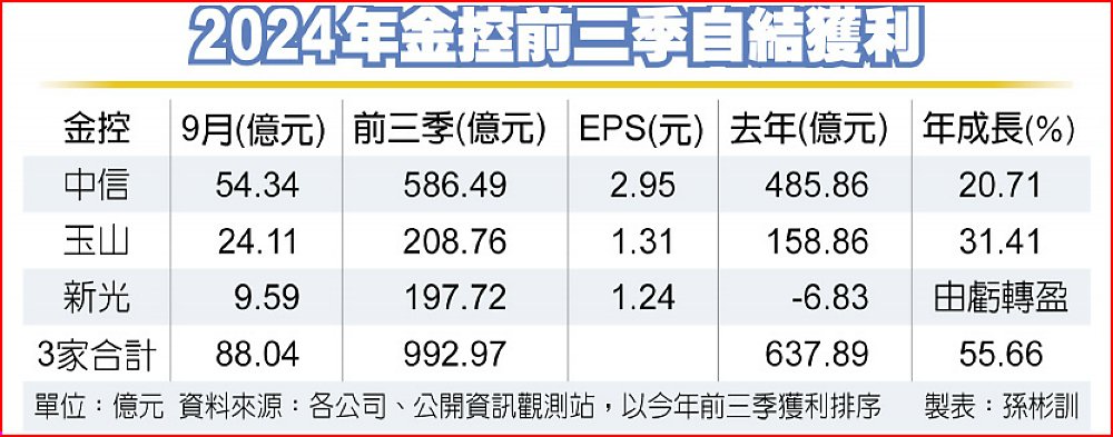 7日已公布9月獲利的三家金控中,前三季獲利的年增率,玉山金年增率達31.41%最高,中信金20.71%居次,新光金則是由虧轉盈。